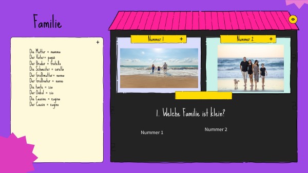 Die Mutter = mamma Der Vater= papà Der Bruder = fratello Die Schwester = sorella Der Großmutter= nonna Der Großvater = nonno Die tante = zia Der Onkel = zio Die Cousine = cugina Der Cousin = cugino