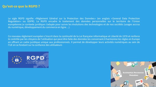 Le sigle RGPD signifie « Règlement Général sur la Protection des Données » (en anglais « General Data Protection Regulation » ou GDPR). Le RGPD encadre le traitement des données personnelles sur le territoire de l’Union européenne.Le contexte juridique s’adapte pour suivre les évolutions des technologies et de nos sociétés (usages accrus du numérique, développement du commerce en ligne…). Ce nouveau règlement européen s’inscrit dans la continuité de la Loi française informatique et Liberté de 1978 et renforce le contrôle par les citoyens de l’utilisation qui peut être faite des données les concernant.Il harmonise les règles en Europe en offrant un cadre juridique unique aux professionnels. Il permet de développer leurs activités numériques au sein de l’UE en se fondant sur la confiance des utilisateurs