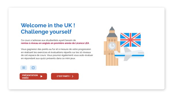 Ce cours s'adresse aux étudiant(e)s ayant besoin deremise à niveau en anglais en première année de Licence LEA.Vous gagnerez des points au fur et à mesure de votre progression en réalisant les exercices et évaluations répartis sur les 10 niveaux de cet espace de cours. Vous pourrez également vous auto-évaluer en répondant aux quizz présents dans ce mini-jeux.