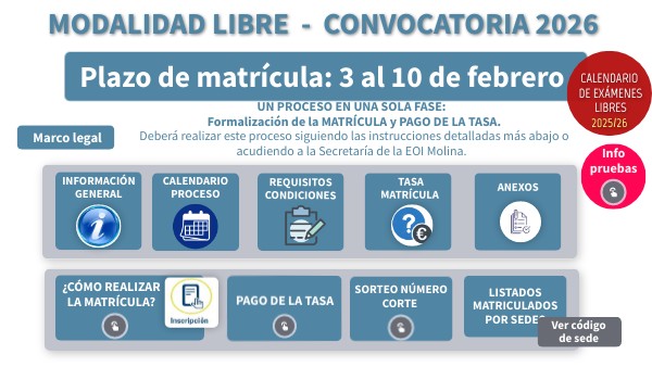 - Es importante comprobar el código de sede, pues la EOI de Molina tiene varias sedes: Molina, Archena, Cieza, Jumilla y Yecla. Cada una de ellas tiene un código y cada candidato/a deberá presentarse en la sede que se le haya asignado según la distribución de espacios y recursos humanos.