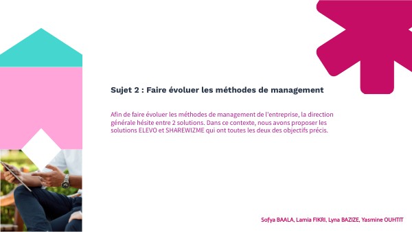 Afin de faire évoluer les méthodes de management de l'entreprise, la direction générale hésite entre 2 solutions. Dans ce contexte, nous avons proposer les solutions ELEVO et SHAREWIZME qui ont toutes les deux des objectifs précis.