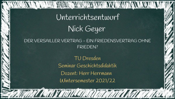 - allgemeines Unterrichtsthema: Der Versailler Vertrag- ein Friedensvertrag ohne Frieden? - erster Themenschwerpunkt: Die Erarbeitung und Aufführungen der Ziele der Staaten und Rahmenbedingungen sowie Bestimmungen des Versailler Vertrages. - zweiter Themenschwerpunkt: Die rollenspielende diskutierenden Ziele der Staaten und der Bestimmungen des Versailler Vertrages hinsichtlich des Charakters eines Friedenvertrages nach Beendigung des Ersten Weltkrieges.