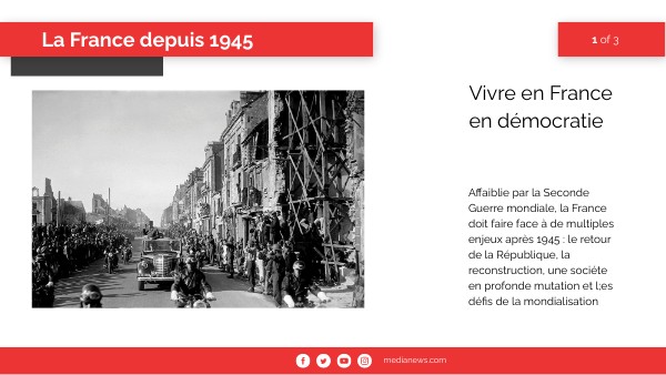 Affaiblie par la Seconde Guerre mondiale, la France doit faire face à de multiples enjeux après 1945 : le retour de la République, la reconstruction, une sociéte en profonde mutation et l;es défis de la mondialisation