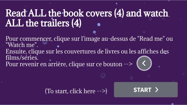 Pour commencer, clique sur l'image au-dessus de "Read me" ou "Watch me".Ensuite, clique sur les couvertures de livres ou les affiches des films/séries.Pour revenir en arrière, clique sur ce bouton -->