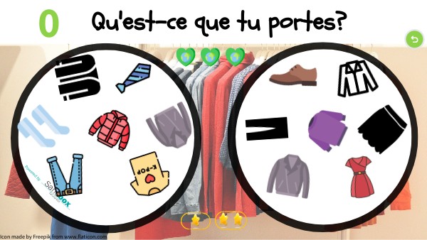 We will work up to playing Dobble to practise our Talking skills.1. Revise the vocabulary using the flashcards. 2. Work through the 3 practice exercises. 2. Play Dobble! Say the matching item in French then click on the picture. Start with "je porte...." Player A: left circle. Player B: right circle. (You could have one iPad open on the vocabulary for support.) Press to come back to this slide.