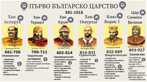 - обединява прабългари и славяни; - разграмявя византийците; -създава България 681г.; столица Плиска.