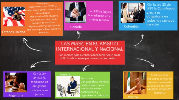 Tres etapas:Experimentacion (1970) se establecieron centros comuntarios de mediacion -Implantacion (1980) Apoyo financiero para centros de solucion de conflictos -Regulacion (1990) Creacion de comisiones para llevar acabo los metodos
