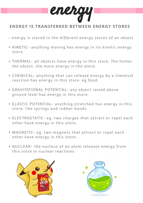 - CHEMICAL- anything that can release energy by a chemical reaction has energy in this store, eg food.