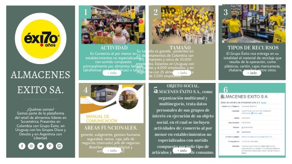 OBJETO SOCIAL.ALMACENES ÉXITO S.A., como organización multicanal y multinegocio, trata datos personales de sus grupos de interés en ejecución de su objeto social, en el cual se incluyen actividades de: comercio al por menor en establecimientos no especializados con surtido compuesto por todo tipo de artículos y servicios de consumo.