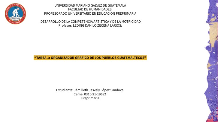 UNIVERSIDAD MARIANO GALVEZ DE GUATEMALA FACULTAD DE HUMANIDADES PROFESORADO UNIVERSITARIO EN EDUCACIÓN PREPRIMARIA DESARROLLO DE LA COMPETENCIA ARTÍSTICA Y DE LA MOTRICIDAD Profesor: LEDING DANILO ZECEÑA LARIOS; “TAREA 1: ORGANIZADOR GRAFICO DE LOS PUEBLOS GUATEMALTECOS” Estudiante: Jámilleth Jesvely López Sandoval Carné: 0315-21-19692 Preprimaria