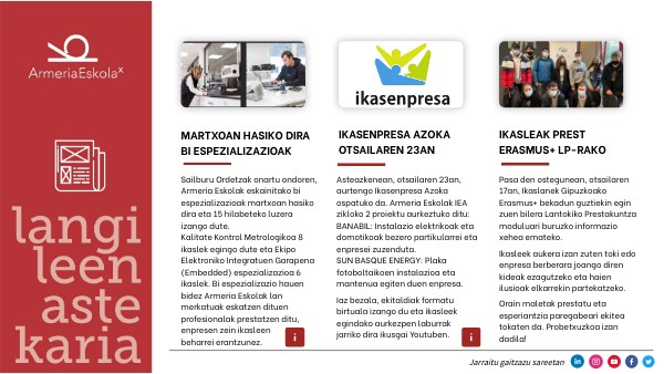 Asteazkenean, otsailaren 23an, aurtengo Ikasenpresa Azoka ospatuko da. Armeria Eskolak IEA zikloko 2 proiektu aurkeztuko ditu: BANABIL: Instalazio elektrikoak eta domotikoak bezero partikularrei eta enpresei zuzenduta. SUN BASQUE ENERGY: Plaka fotoboltaikoen instalazioa eta mantenua egiten duen enpresa. Iaz bezala, ekitaldiak formatu birtuala izango du eta ikasleek egindako aurkezpen laburrak jarriko dira ikusgai Youtuben.
