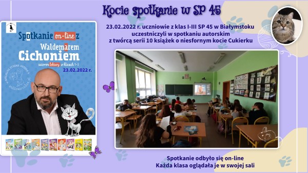 23.02.2022 r. uczniowie z klas I-III SP 45 w Białymstoku uczestniczyli w spotkaniu autorskim z twórcą serii 10 książek o niesfornym kocie Cukierku