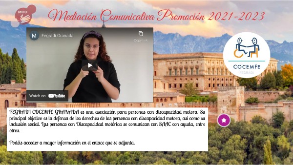 FEGRADI COCEMFE GRANADA es una asociación para personas con discapacidad motora. Su principal objetivo es la defensa de los derechos de las personas con discapacidad motora, así como su inclusión social. Las personas con Discapacidad motórica se comunican con SAAC con ayuda, entre otros. Podéis acceder a mayor información en el enlace que se adjunta.