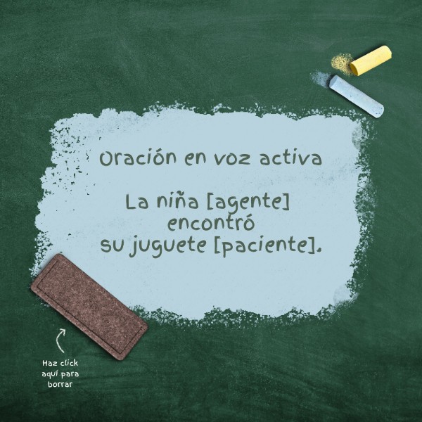 Oración en voz activaLa niña [agente] encontrósu juguete [paciente].