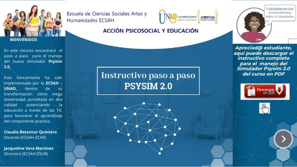 En este instructivo encontrará la ruta e indicaciones puntuales para el manejo del nuevo simulador Psysim 2.0, este recurso ha sido implementado por la ECSAH – UNAD, dentro de su transformación como universidad acreditada en alta calidad potenciando la educación a través de las TIC.