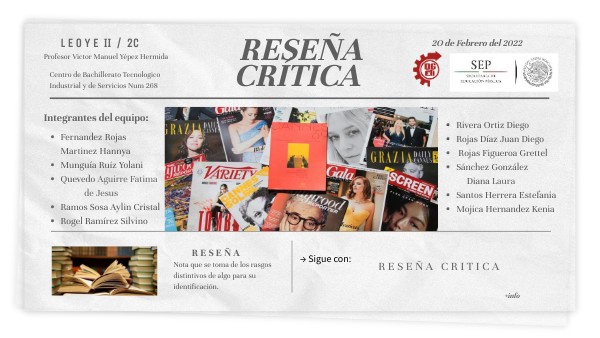 CUADERNILLO DE TRABAJO LEOYE II, páginas 17, 18 y 22https://www.uanl.mx/utilerias/chip/descarga/resena.pdfhttps://www.significados.com/caracteristicas-de-una-resena/ https://www.significados.com/resena/