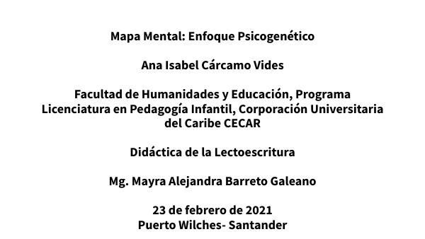 Mapa Mental: Enfoque Psicogenético Ana Isabel Cárcamo Vides Facultad de Humanidades y Educación, Programa Licenciatura en Pedagogía Infantil, Corporación Universitaria del Caribe CECAR Didáctica de la Lectoescritura Mg. Mayra Alejandra Barreto Galeano 23 de febrero de 2022 Puerto Wilches- Santander