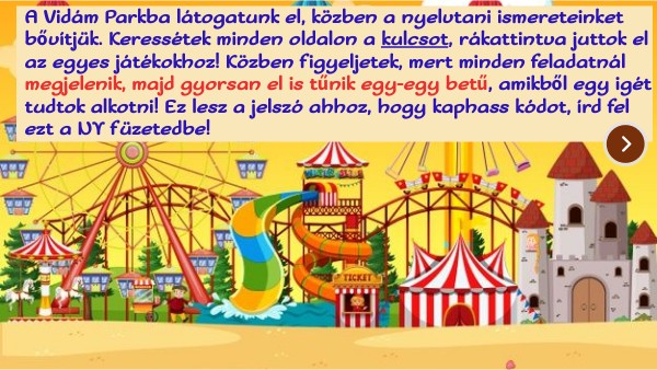 A Vidám Parkba látogatunk el, közben a nyelvtani ismereteinket bővítjük. Keressétek minden oldalon a kulcsot, rákattintva juttok el az egyes játékokhoz! Közben figyeljetek, mert minden feladatnál megjelenik, majd gyorsan el is tűnik egy-egy betű, amikből egy igét tudtok alkotni! Ez lesz a jelszó ahhoz, hogy kaphass kódot, írd fel ezt a NY füzetedbe!