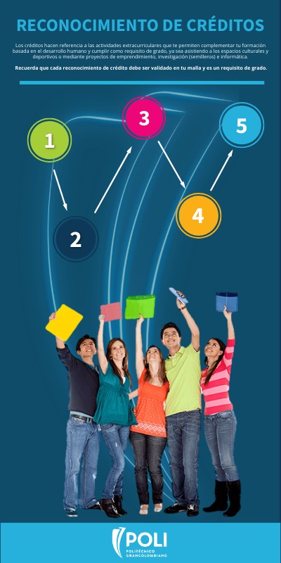 Los créditos hacen referencia a las actividades extracurriculares que te permiten complementar tu formación basada en el desarrollo humano y cumplir como requisito de grado, ya sea asistiendo a los espacios culturales y deportivos o mediante proyectos de emprendimiento, investigación (semilleros) e informática. Recuerda que cada reconocimiento de crédito debe ser validado en tu malla y es un requisito de grado.