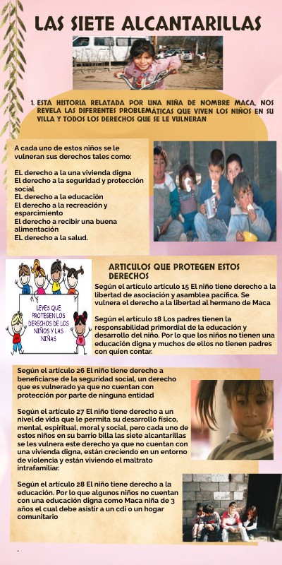 La convención le garantiza al niño la protección de sus derechos para ser íntegros, ser protegidos y recibir cuidados especiales, debido a su niñez ya que no son sujetos de defender su bienestar y por qué no tienen un estado de maduración física, mental; ahora bien en el caso de la historia de la villa- las siete alcantarillas, los niños viven en un mundo de pobre y vulneración infantil, por lo que no cuentan con acceso a una buena educación, protección social, vivienda digna, libertad, recreación infantil, atención de la salud y servicios básicos, lo que hace que su mundo se convierta en un lugar hostil para sobrevivir acorde a sus condiciones de dificultades y pobreza.