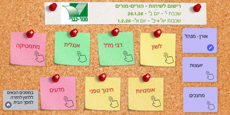 רישום לשיחות - הורים-מורים שכבת י' - יום ב' - 26.1.26 שכבת יא' - יום א'- 1.2.26