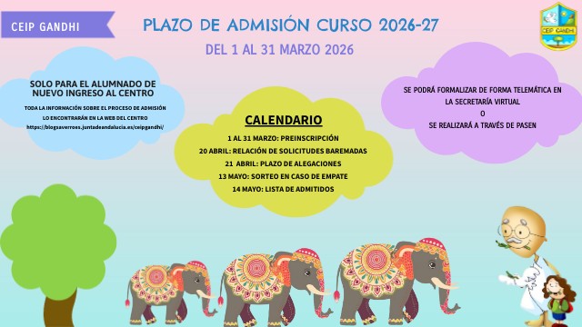 TODA LA INFORMACIÓN SOBRE EL PROCESO DE ADMISIÓN LO ENCONTRARÁN EN LA WEB DEL CENTRO https://blogsaverroes.juntadeandalucia.es/ceipgandhi/