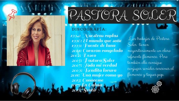 Los trabajos de Pastora Soler tienen mayoritariamente un claro referente flamenco. Pero también ella consigue conjugar sonidos cercanos al flamenco y toques pop.