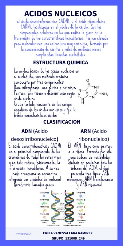 el ácido desoxirribonucleico (ADN), y el ácido ribonucleico (ARN), localizados en el núcleo de la célula. Son los componentes celulares en los que radica la clave de la transmisión de las características hereditarias. Tienen elevado peso molecular con una estructura muy compleja, formada por la condensación de cientos o miles de unidades menos complicadas llamadas nucleótidos.