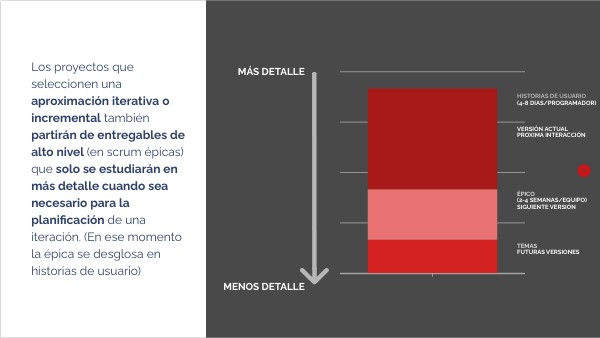 Los proyectos que seleccionen una aproximación iterativa o incremental también partirán de entregables de alto nivel (en scrum épicas) que solo se estudiarán en más detalle cuando sea necesario para la planificación de una iteración. (En ese momento la épica se desglosa en historias de usuario)
