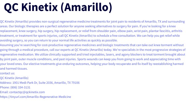QC Kinetix (Amarillo) provides non-surgical regenerative medicine treatments for joint pain to residents of Amarillo, TX and surrounding areas. Our biologic therapies are a perfect solution for anyone seeking alternatives to surgery for pain. If you're looking for a knee replacement, knee surgery, hip surgery, hip replacement, or relief from shoulder pain, elbow pain, wrist pain, plantar fasciitis, arthritis treatment, or treatment for sports injuries, call QC Kinetix (Amarillo) to schedule a free consultation. We can help you get relief while avoiding surgery, so you can return to your normal life activities as quickly as possible. Assuming you're searching for cost-productive regenerative medicines and biologic treatments that can take out knee torment without going through a medical procedure, call our experts at QC Kinetix (Amarillo) today. We're specialists in the most progressive strategies of regenerative medication. We utilize clinically supported and tried injectables, lasers, and agony blockers to treat torment brought about by joint pain, outer muscle conditions, and past injuries. Sports wounds can keep you from going to work and appreciating time with your loved ones. Our elective treatments give enduring outcomes, helping your body recuperate and fix itself by reestablishing harmed and harmed tissues. contact us: QC Kinetix (Amarillo) Address: 1901 Medi-Park Dr, Suite 2036, Amarillo, TX 79106 Phone: (806) 334-3131 Email: contactqc@qckinetix.com https://tinyurl.com/Amarillo-Regenerative-Medicine