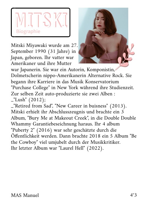Mitski Miyawaki wurde am 27. September 1990 (31 Jahre) in Japan, geboren. Ihr vatter war Amerikaner und ihre Mutter war Japanerin. Sie war ein Autorin, Komponistin, Dolmetscherin nippo-Amerikanerin Alternative Rock. Sie begann ihre Karriere in das Musik Konservatorium "Purchase College" in New York während ihre Studienzeit. Zur selben Zeit auto-produzierte sie zwei Alben : _"Lush" (2012); _"Retired from Sad", "New Career in buisness" (2013). Mitski erhielt ihr Abschlusszeugnis und brachte ein 3 Album, "Bury Me at Makeout Creek", in die Double Double Whammy Garantiebeseichnung haraus. Ihr 4 album "Puberty 2" (2016) war sehr geschätzte durch die Öffentlichkeit werden. Dann brachte 2018 ein 5 Album "Be the Cowboy" viel umjubelt durch der Musikkritiker. Ihr letzter Album war "Laurel Hell" (2022).