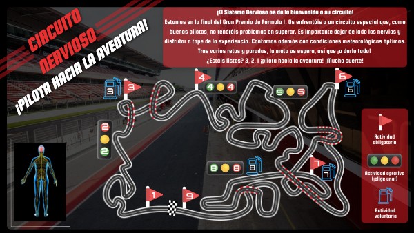 ¡El Sistema Nervioso os da la bienvenida a su circuito!Estamos en la final del Gran Premio de Fórmula 1. Os enfrentáis a un circuito especial que, como buenos pilotos, no tendréis problemas en superar. Es importante dejar de lado los nervios y disfrutar a tope de la experiencia. Contamos además con condiciones meteorológicas óptimas. Tras varios retos y paradas, la meta os espera, así que ¡a darlo todo! ¿Estáis listos? 3, 2, 1 ¡pilota hacia la aventura! ¡Mucha suerte!