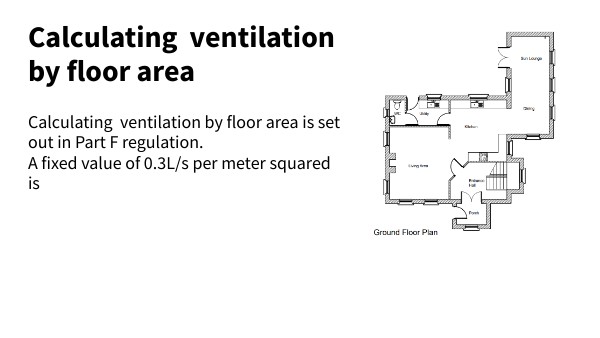 Calculating ventilation by floor area is set out in Part F regulation. A fixed value of 0.3L/s per meter squared is