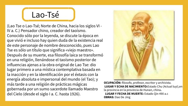OCUPACIÓN: filosofo, profesor, escritor y archivista. LUGAR Y ECHA DE NACIMIENTO:Estado Chu (Actual luyi),en la provincia en la provincia de Hunan, china. LUGAR Y FECHA DE MUERTE: Estado Qin 490 a.c OBRAS: Dao De Jing