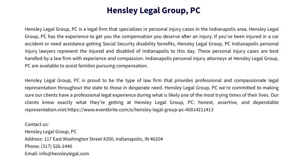 Hensley Legal Group, PC is a legal firm that specializes in personal injury cases in the Indianapolis area. Hensley Legal Group, PC has the experience to get you the compensation you deserve after an injury. If you've been injured in a car accident or need assistance getting Social Security disability benefits, Hensley Legal Group, PC Indianapolis personal injury lawyers represent the injured and disabled of Indianapolis to this day. These personal injury cases are best handled by a law firm with experience and compassion. Indianapolis personal injury attorneys at Hensley Legal Group, PC are available to assist families pursuing compensation. Hensley Legal Group, PC is proud to be the type of law firm that provides professional and compassionate legal representation throughout the state to those in desperate need. Hensley Legal Group, PC we’re committed to making sure our clients have a professional legal experience during what is likely one of the most trying times of their lives. Our clients know exactly what they’re getting at Hensley Legal Group, PC: honest, assertive, and dependable representation.visit:https://www.eventbrite.com/o/hensley-legal-group-pc-40014211413 Contact us: Hensley Legal Group, PC Address: 117 East Washington Street #200, Indianapolis, IN 46204 Phone: (317) 526-1440 Email: info@hensleylegal.com