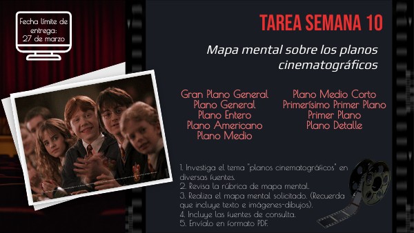 1. Investiga el tema "planos cinematográficos" en diversas fuentes. 2. Revisa la rúbrica de mapa mental. 3. Realiza el mapa mental solicitado. (Recuerda que incluye texto e imágenes-dibujos). 4. Incluye las fuentes de consulta. 5. Envíalo en formato PDF.