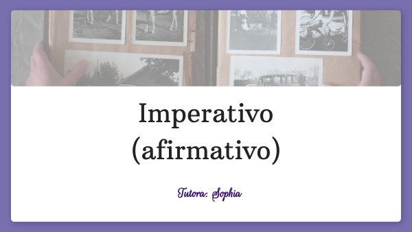 Es igual que la conjugación de Él/ Ella del presente. Ejemplos: Presente Él/ Ella - Imperativo Tú Él come Tú come Ella habla Tú habla Él vive Tú vive Ella estudia Tú estudia Él cierra Tú cierra Ella duerme Tú duerme