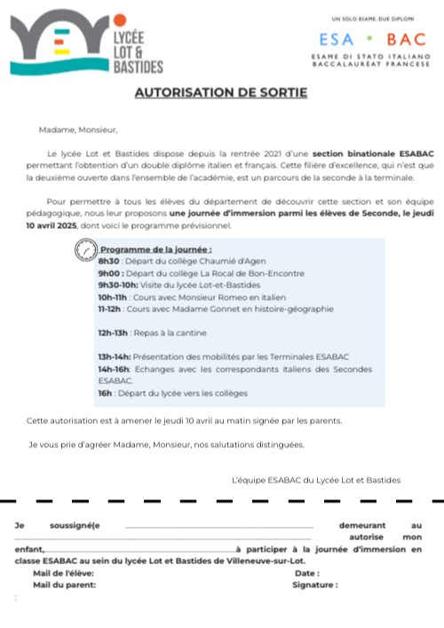 Cette autorisation est à amener le jeudi 10 avril au matin signée par les parents. Je vous prie d’agréer Madame, Monsieur, nos salutations distinguées. L’équipe ESABAC du Lycée Lot et Bastides