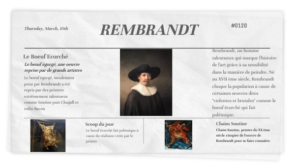 Rembrandt, un homme talentueux qui marque l'histoire de l'art grâce à sa sensibilité dans la manière de peindre. Né au XVII ème siècle, Rembrandt choque la population à cause de certaines oeuvres dites "violentes et brutales" comme le boeuf écorché qui fait polémique.