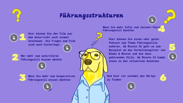 Hier können Sie einen sehr guten Podcast zum Thema Führungsstile anhören. Ab Minute 26 geht es zum Beispiel um das Verhaltensgitter von Blake & Mouton und die dazu gehörenden Stile. Ab Minute 33 kommt etwas zu den situativen Ansätzen
