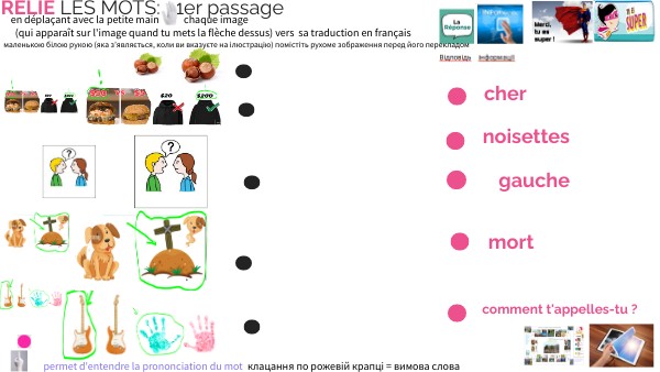 en déplaçant avec la petite main , chaque image (qui apparaît sur la petite image quand tu mets la flèche dessus) vers sa traduction