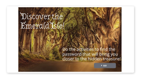 Do the activities. Each correct answer will give you a letter for the password that you will need to enter to get closer to the hidden treasure. If you need help, click on the button! Good luck!