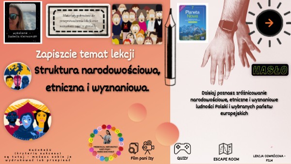 Przypomnienie wiadomości z ostatnich zajęć.1. Wprowadzenie: Czym jest naród? Co oznaczają pojęcia: mniejszość narodowa, mniejszość etniczna i społeczność etniczna? Jakie są różnice między mniejszością narodową, mniejszością etniczną a społecznością etniczną - wykorzystanie NEONA - strona 109.2. Stacje zadniowe - praca z podręcznikiem i kartą pracy - 5 zadań w kopertach. 3. Podsumowanie wiadomości - escape room i quizizz.