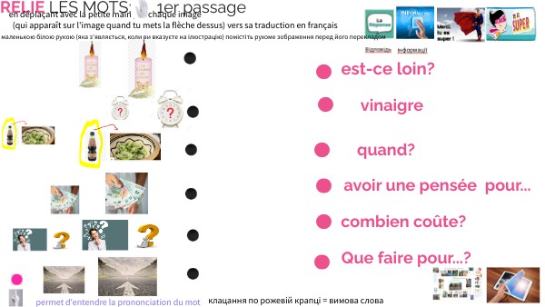 en déplaçant avec la petite main , chaque image (qui apparaît sur l'image quand tu mets la flèche dessus) vers sa traduction en français