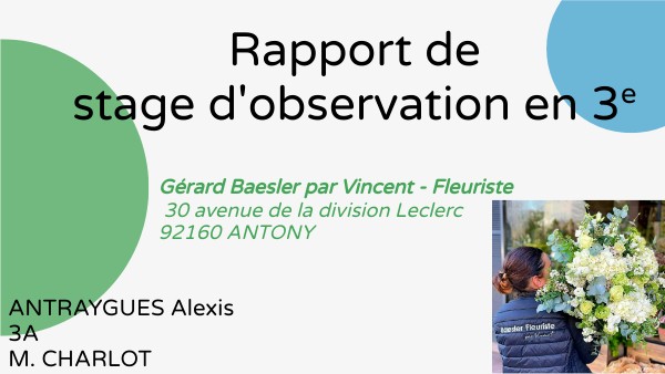 Mes appréciations Le travail de fleuriste est varié, la cadence est soutenue, et cela s'est démontré dés mon 1er jour de stage, jour de la St Valentin. Ce fut un stage très intéressant pour moi car au delà d'avoir beaucoup appris sur les fleurs et les plantes, le fait d'avoir trouvé ce stage par moi même sans faire appel à un membre de ma famille ou de mes connaissances, je me suis senti plus libre de parler et mieux intégré. Vincent Baesler m'a fait des horaires adaptés : 9h-17h, donné une doudoune, la même que celle qu'ont les autres salariés. J'étais ravie de pouvoir travailler dans un endroit lumineux avec vu sur l'extérieur et d'avoir pu observer les différentes tâches de chacun. J'ai été très bien accueilli par l'ensemble du personnel et j'ai été intégré très rapidement à la vie de la boutique, lors des repas du midi. Je n'ai jamais été laissé de côté à ne rien faire ou mis à part lors des conversations. Mon tuteur est une personne très ouverte et prévenante. C'est lui même qui m'a proposé dès le début de mon stage de nous caler un point en fin de semaine afin de répondre à mes questions pour mon rapport. C'est un homme désireux de faire partager sa passion aux autres, c'est pour cela qu'il prend régulièrement des stagiaires et apprentis.