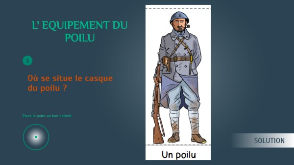 Le casque du soldat se situe sur la tête. Il permet au soldat de se protéger des fragments d'obus qui pourraient le blesser à la tête. Le casque métallique est appuru en 1915.
