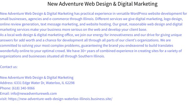 New Adventure Web Design & Digital Marketing has practical experience in versatile WordPress website development for small businesses, agencies and e-commerce through Illinois. Different services we give digital marketing, logo design, online review generation, text message marketing, and website hosting. Our great, reasonable web design and digital marketing services make your business more serious on the web and develop your client base.As a local web design & digital marketing office, we join our energy for innovativeness and our drive for giving unique answers for add worth and a chance for development all through all parts of our client's organizations. We are committed to solving your most complex problems, guaranteeing the brand you endeavored to build translates wonderfully online to your optimal crowd. We have 30+ years of combined experience in creating sites for a variety of organizations and businesses situated all through Southern Illinois. Contact us: New Adventure Web Design & Digital Marketing Address: 6331 Edge Water Dr, Waterloo, IL 62298 Phone: (618) 340-9066 Email: info@newadventureweb.com visit: https://new-adventure-web-design-waterloo-illinois.business.site/