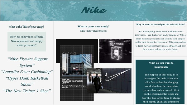 What do you want to investigate? The purpose of this essay is to investigate the main issues that Nike face within this changing world, also how the innovation process has had an overall effect on the environmental issues and how this has forced Nike to change their supply chain and operations process.