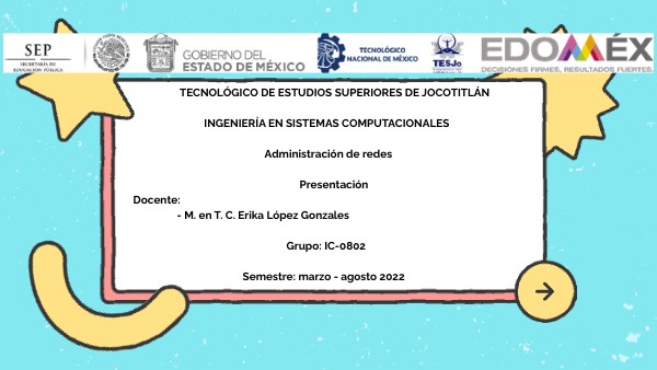 TECNOLÓGICO DE ESTUDIOS SUPERIORES DE JOCOTITLÁN INGENIERÍA EN SISTEMAS COMPUTACIONALES Administración de redes PresentaciónDocente: - M. en T. C. Erika López Gonzales Grupo: IC-0802 Semestre: marzo - agosto 2022