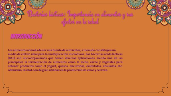 Los alimentos además de ser una fuente de nutrientes, a menudo constituyen unmedio de cultivo ideal para la multiplicación microbiana. Las bacterias ácido lácticas (BAL) son microorganismos que tienen diversas aplicaciones, siendo una de las principales la fermentación de alimentos como la leche, carne y vegetales para obtener productos como el yogurt, quesos, encurtidos, embutidos, ensilados, etc. Asimismo, las BAL son de gran utilidad en la producción de vinos y cerveza.